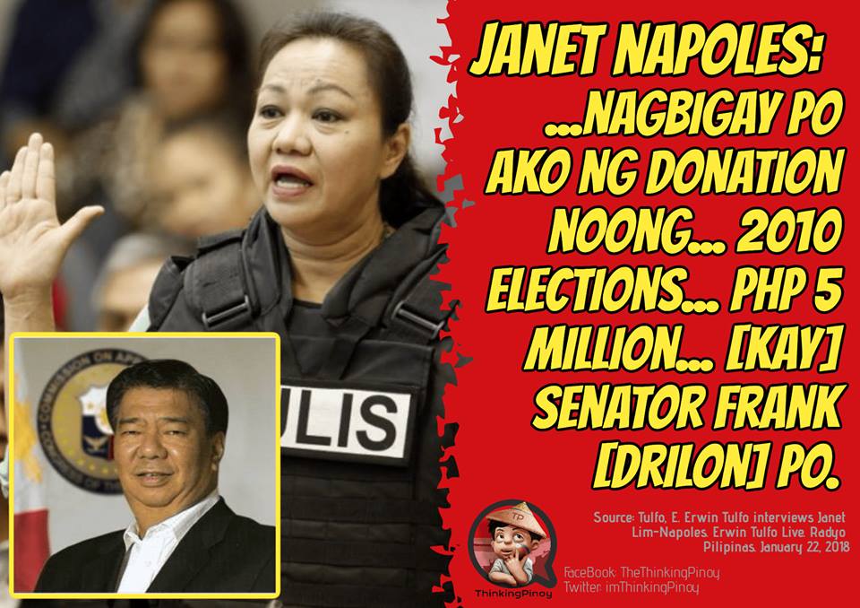 Ganito ang naging tugon ni Presidential Spokesperson Harry Roque sa naging pahayag ng tinaguriang PDAF Queen Janet Lim Napoles laban kay Senador Frank Drilon. Ayon kay Napoles, lubos siyang nasaktan nang itanggi ni Drilon na magkaibigan sila, matapos niyang mabigyan ito ng 5 million noong 2010. Handa daw maglabas si Napoles ng ebidensiya at testigo laban sa senador.
